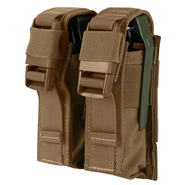 The DOUBLE FLASHBANG POUCH is designed to carry two flashbangs securely with adjustable flaps and quick-release buckles, ensuring rapid accessibility. Its compact form, measuring 5.25"H x 4.5"W x 2"D, fits snugly into your gear without adding excess bulk. The hook and loop silencer and elastic retention keeper enhance its functionality, making it perfect for high-stakes missions.