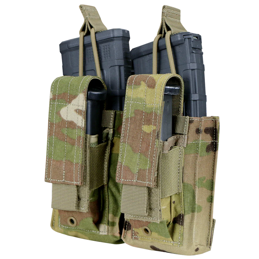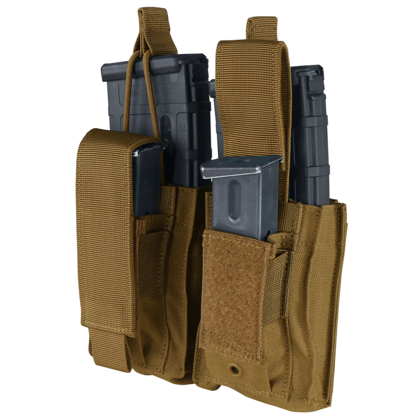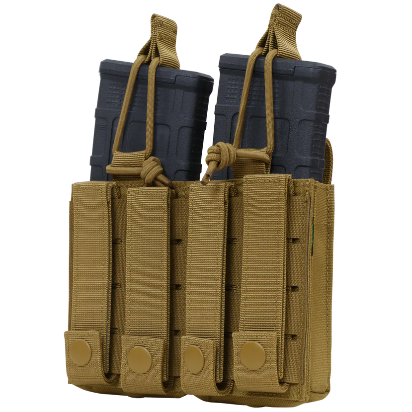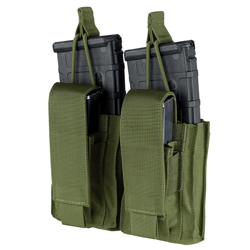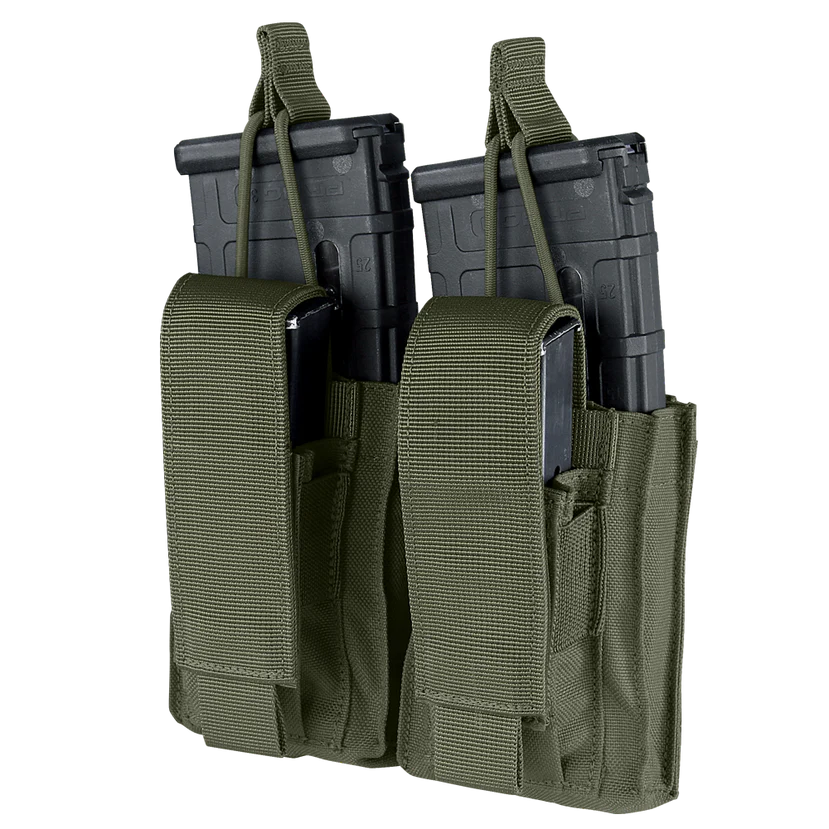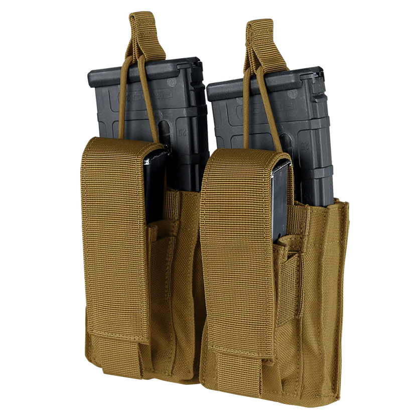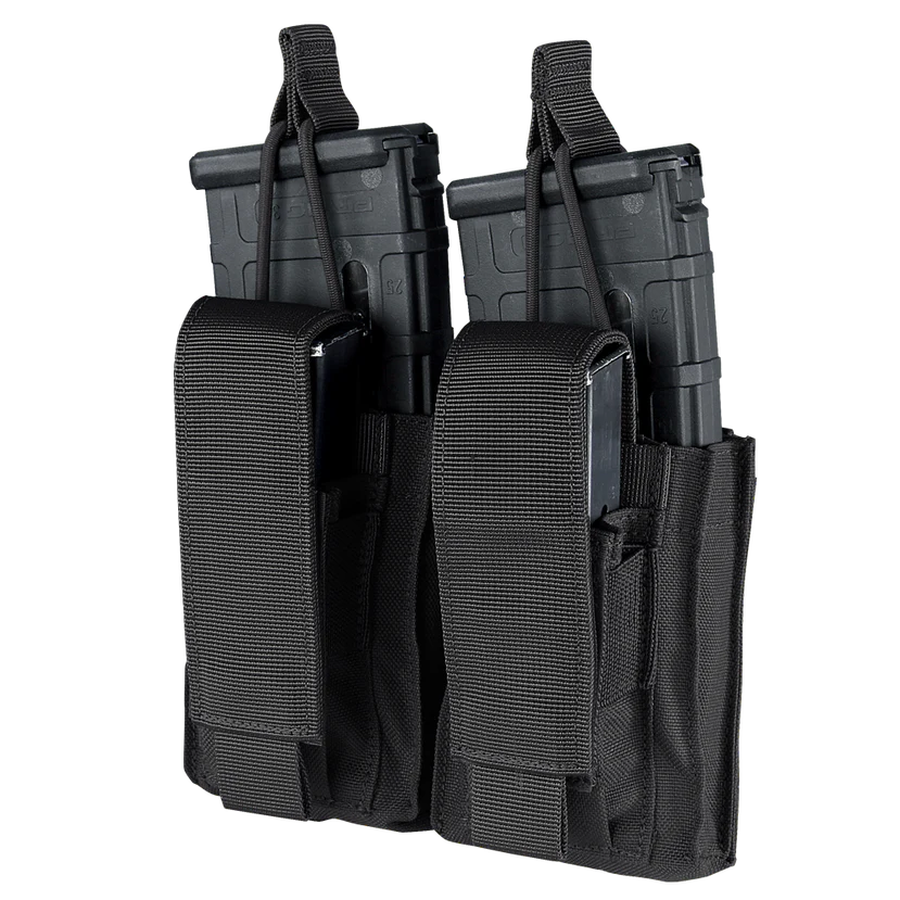 Utilize the Condor Outdoor Double Kangaroo Mag Pouch Gen II as a versatile accessory addition to your loadout. The result of suggestions to our popular magazine pouches from LE/MIL personnel have called for an upgrade to our overall open top exposure for high speed reloading/storage. This Condor mag pouch is designed to hold both AR/M4 and pistol magazines in one convenient modular attachment. The simple, effective design incorporates an open top bungee-retention and adjustable flap closures to ensure that your magazines stay securely stashed within, and can be deployed in a moment’s notice. The internal side of the pouch has been revamped to laser cut MOLLE to enhance durability and shave weight. The Condor Double Kangaroo Mag Pouch is compatible with MOLLE webbing, making it easy to attach in a variety of locations on your plate carrier or chest rig for rapid access.