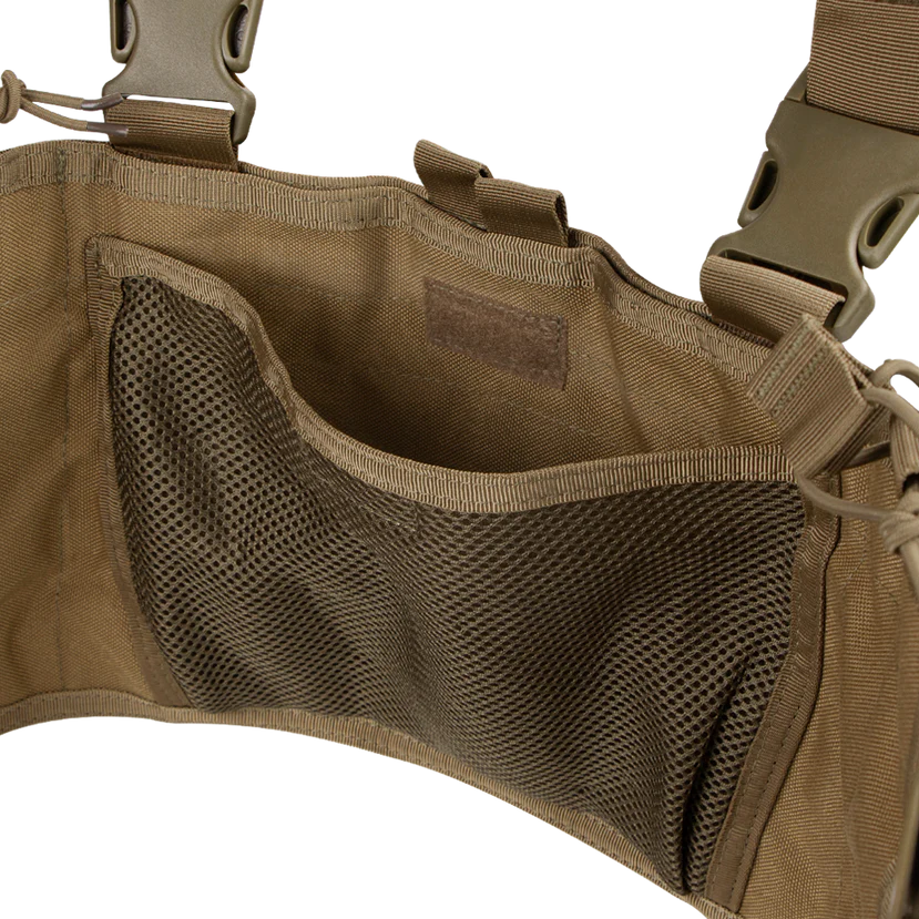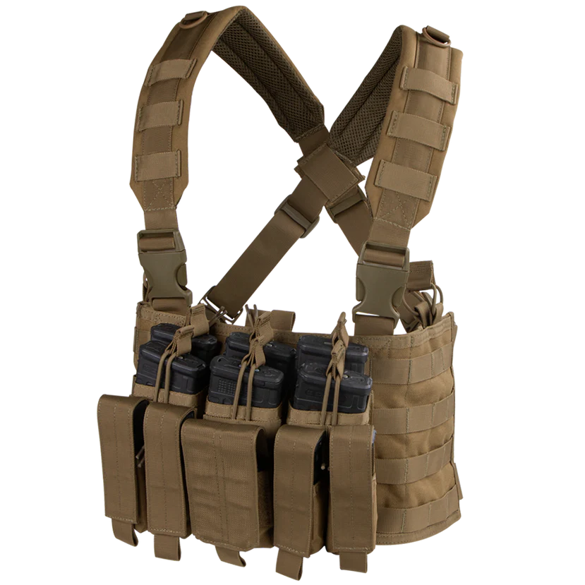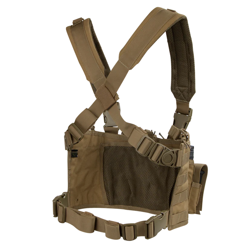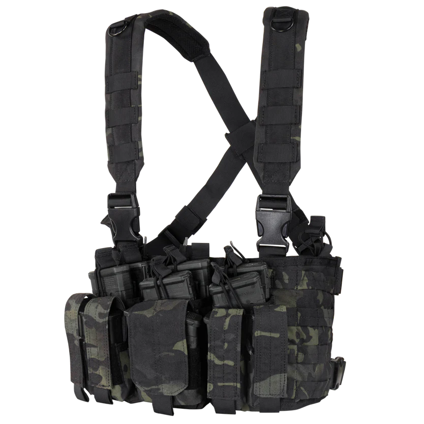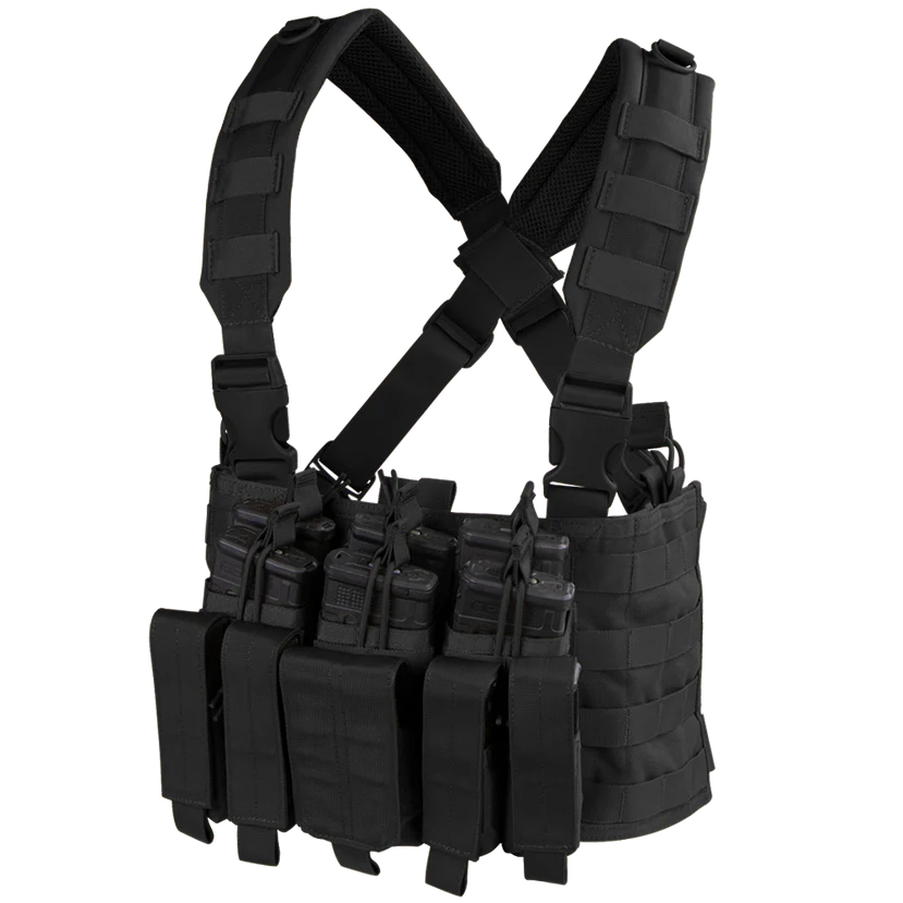 The Condor Recon Chest Rig is designed with built-in stacker/kangaroo style mag pouches to allow the user rapid, seamless access to mags for faster reloads with up to six AR/M4 mags and six pistol mags. The adjustable and removable flaps on the pistol pouches also allow the user to keep a knife, multi-tool, or other small accessories close at hand while training or on duty. This Condor Recon chest rig setup also features an interior mesh pocket for safely storing items close to the body. Swivi-Lockster quick-release buckles allow you to remove the chest rig quickly and easily when necessary. With grommets for drainage and padded cross-back shoulder straps, this Condor chest rig also helps you stay comfortable and dry.