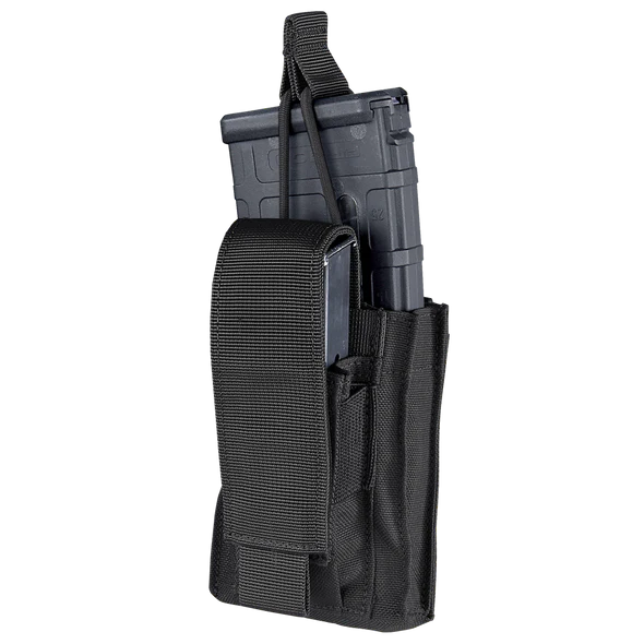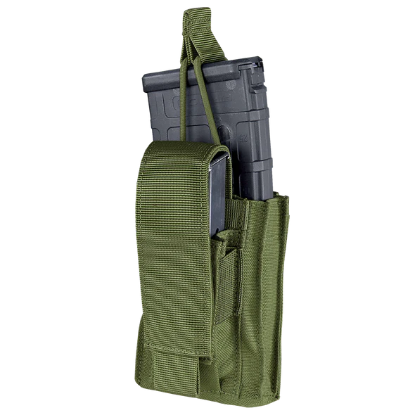 Utilize the Condor Outdoor Single Kangaroo Mag Pouch Gen II as a versatile accessory addition to your loadout. The result of suggestions to our popular magazine pouches from LE/MIL personnel have called for an upgrade to our overall open top exposure for high speed reloading/storage. This Condor mag pouch is designed to hold both AR/M4 and pistol magazines in one convenient modular attachment. The simple, effective design incorporates an open top bungee-retention and adjustable flap closures to ensure that your magazines stay securely stashed within, and can be deployed in a moment’s notice. The internal side of the pouch has been revamped to laser cut MOLLE to enhance durability and shave weight. The Condor Single Kangaroo Mag Pouch is compatible with MOLLE webbing, making it easy to attach in a variety of locations on your plate carrier or chest rig for rapid access.
