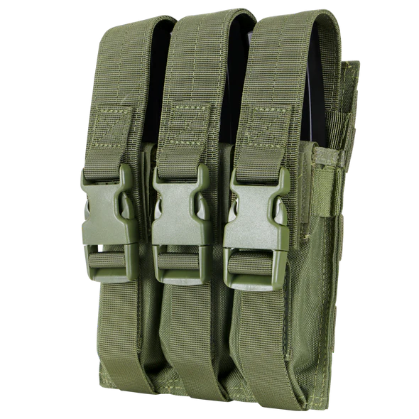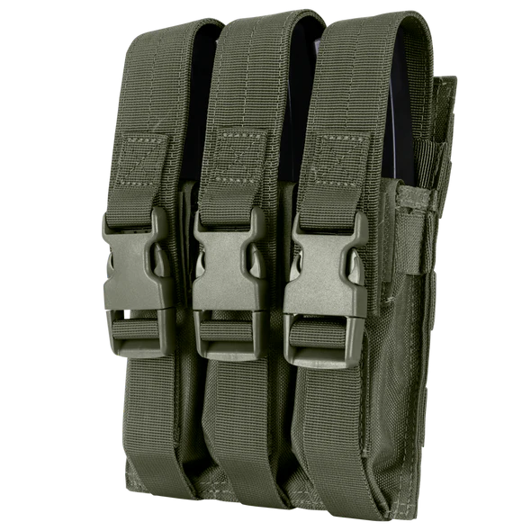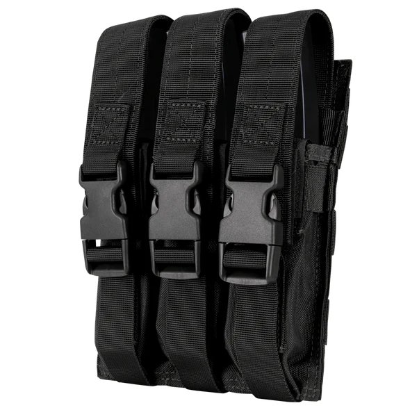 Make sure you have access to multiple magazines when you use the Triple MP5 Mag Pouch from Condor Outdoor. This durable accessory securely carries up to three MP5 magazines. Each one is secured via a hook and loop flap and has side release buckles that can be unfastened rapidly and easily with one hand. This feature of the Condor Triple MP5 Mag Pouch ensure access to your magazines at a moment's notice. Whether you're a first responder or an outdoorsman, you can use this pouch to keep extra ammunition on hand or to store spent magazines safely. Because the pouch is compatible with MOLLE webbing, you can easily attach it to a belt, harness, vest, or backpack. Choose from a variety of kit-compatible colors when you order the Triple MP5 Magazine Pouch.