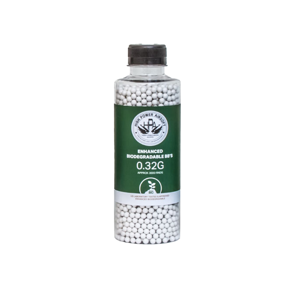 Our 0.32G Our proprietary ingredients enhance the biodegradation of HighPowerAirsoft™ Enhanced Biodegradable BB in a biologically active landfill (appropriate facilities not available in all areas). An independent test that represent biologically active landfill effects on our products have shown up to 25.6% adjusted biodegradation in 358days. *Results may vary based on environmental conditions*