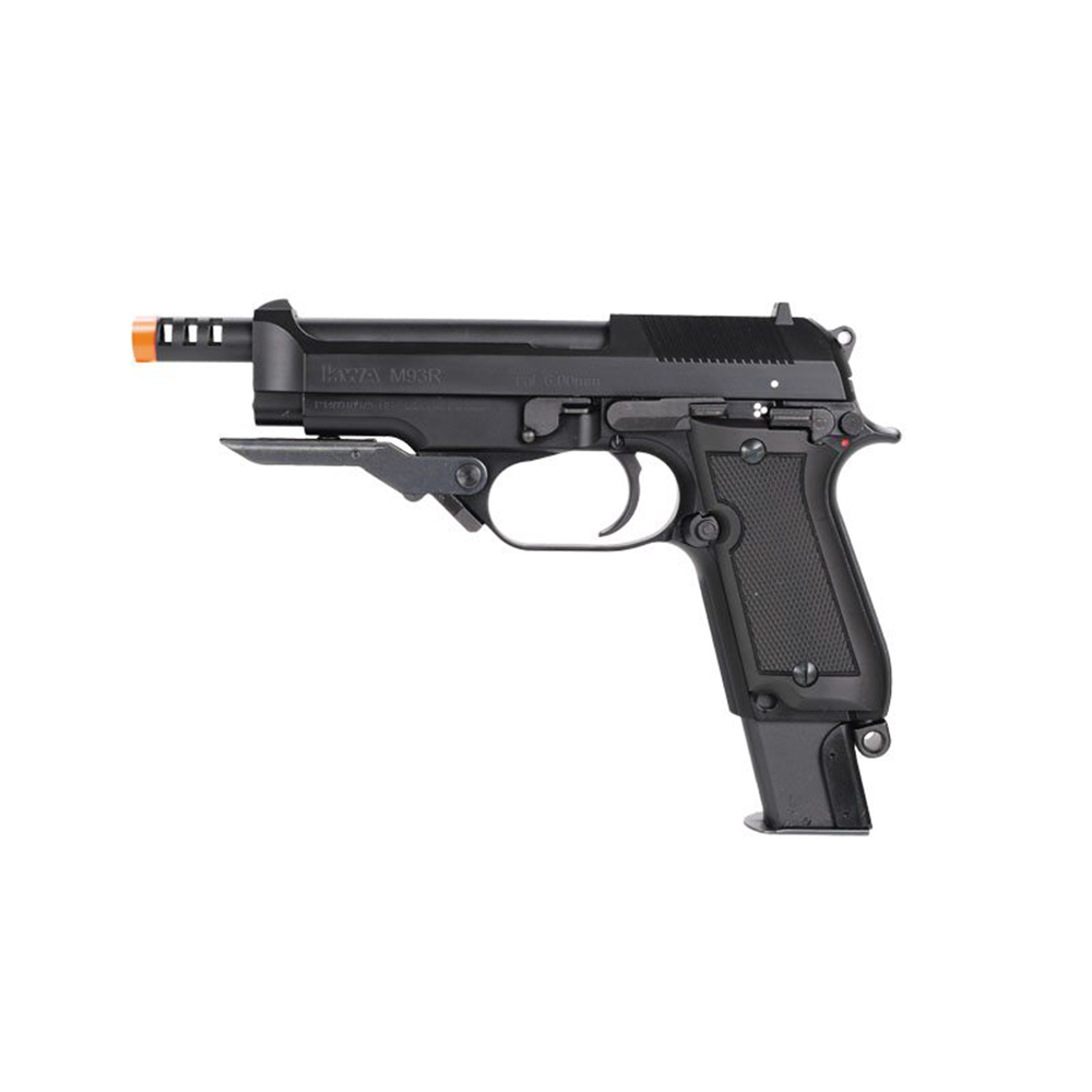 The M93RII is a weapon that is known for its unique capabilities that other full sized handguns cannot provide. The KWA M93RII features a select fire switch that allows the weapon to fire in three round burst or semi-automatic modes giving the weapon the flexibility to adapt to many combat situations. A folding front grip provides the operator increased control while operating on full auto and three round burst modes. The full metal construction of the weapon increases rigidity and durability, while the updated NS2 system provides reliable outstanding performance. The KWA M93R II provides the shooter massive amounts of firepower while maintaining a pistol frame.